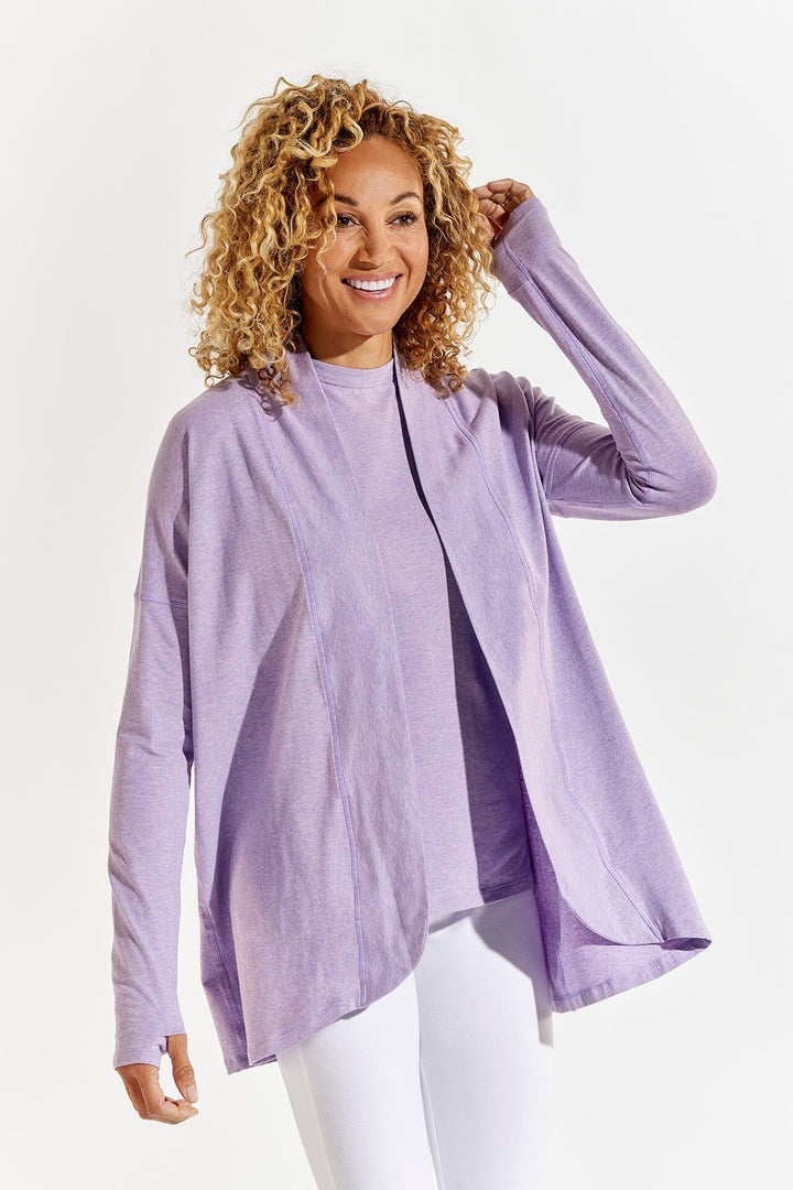 Our versatile LumaLeo Sun Wrap offers on-the-go UPF 50+ coverage whenever your arms, shoulders or legs need a little extra shade. This stylish wrap features an extended shawl collar, full length sleeves with thumbholes and a feminine slit detail all in our super-soft Organic Cotton ZnO fabric. It's a wonderful way to cover up while giving any sun-safe athleisure look a little flair!