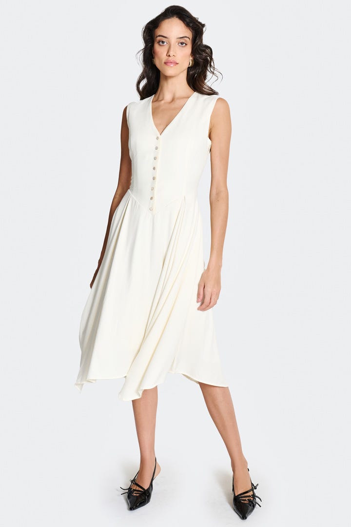 Experience effortless sun-safe elegance with the UPF50+ Monroe Dress from the exclusive Coolibar X Mott50 drop. Inspired by the best-selling Mott50 Ballerina Dress, this ivory-colored dress combines sophistication with sun protection. The Cotton Linen Blend bodice and buttery, stretchy UPF50+ Moduri fabric skirt offer a luxurious combination. With a low V-Neck, golden Mother of Pearl button fastening, concealed side zipper, and inner lining, the Monroe Dress is the epitome of elegance. Pair it with the Melbourne Shawl for an extra layer of sun protection. Experience fashion, sophistication, and UPF50+ sun safety in every detail.